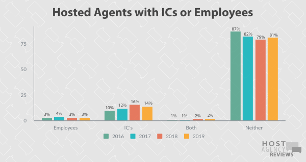 19% of hosted agents reported having ICs and/or employees in 2019 (ICs, 14%; employees, 3%; Both, 2%). Combined, this was slightly lower than the prior year (21%).