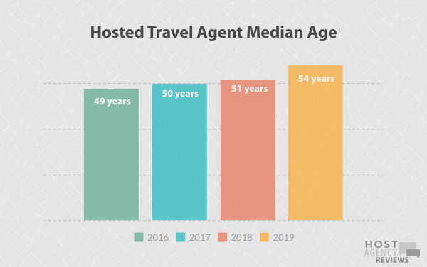 The median age of hosted travel agents has steadily increased from 49 to 54 since we started collecting data. Below you can see the changes in median age year over year: