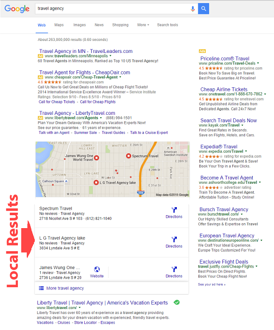 You'll have an advantage over large sites because as a local business, your name will pop up in Google's local search results. For example, when I Googled "travel agency" a few local travel agency names showed up before Liberty Travel.