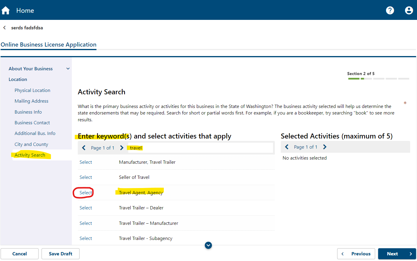 When you get to the 'Activity Search' section (below), select 'Travel Agent, Agency'. This will trigger the adding of the Seller of Travel endorsement (form) to your application.