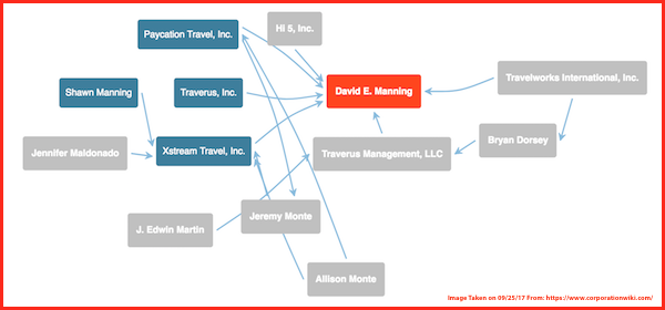 David E. Manning was president of now-defunct Travelworks International, Inc. and is currently the president of Paycation (which now shows up as TraVerus, over which he also presides) and he is also the chairman of XStream Travel. All of these are travel MLMs. 6